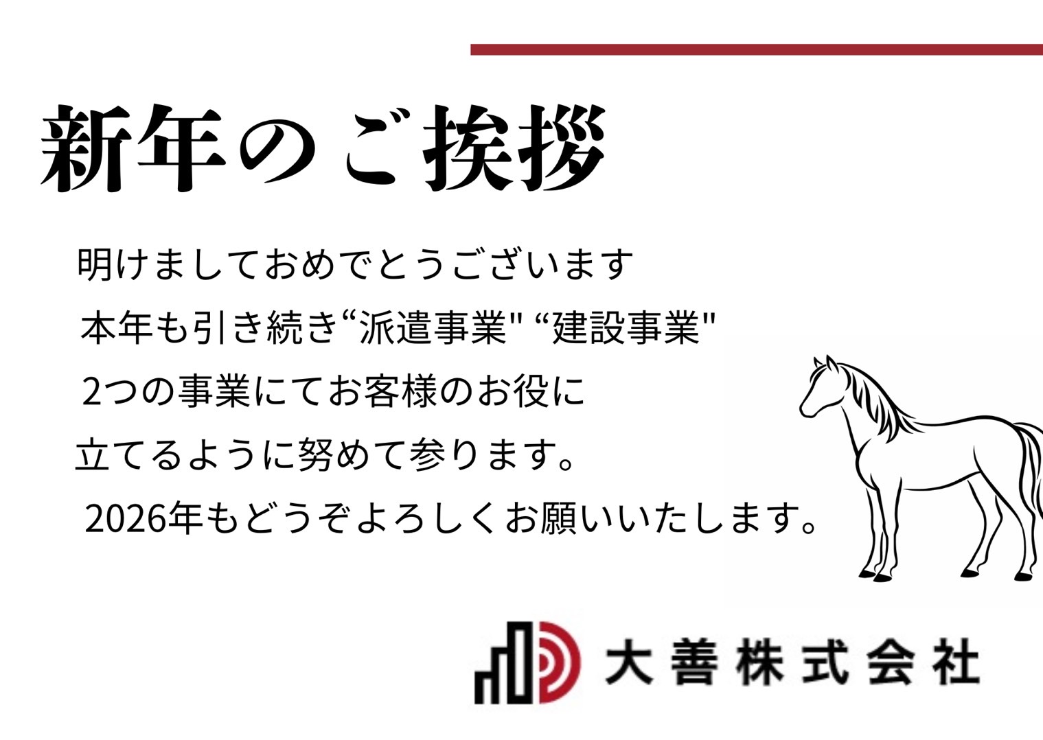 新年のご挨拶 2026.01.01お知らせ Post Share Hatena Pocket RSS feedly Pin it Post Share お知らせ 会社設立6周年のお知らせ 関連記事一覧 顧問先変更のお知らせ 住宅省エネ2024キャンペーン ホームページリニューアルのお知らせ 2023年 年末年始休暇のご案内 住宅省エネ2023年キャンペーンのお知らせ 2024年 新年のご挨拶 Jリーグの試合会場に会社名が掲載されました! 平将明衆議院議員を訪問させていただきました。 芝信用金庫と取引開始のお知らせ